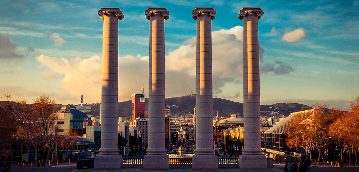 The four columns shown are part of the Magic Fountains of Montjuïc, which offer an impressive light, music and color display in the evenings, with the national museum at the top of the hill.